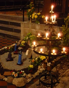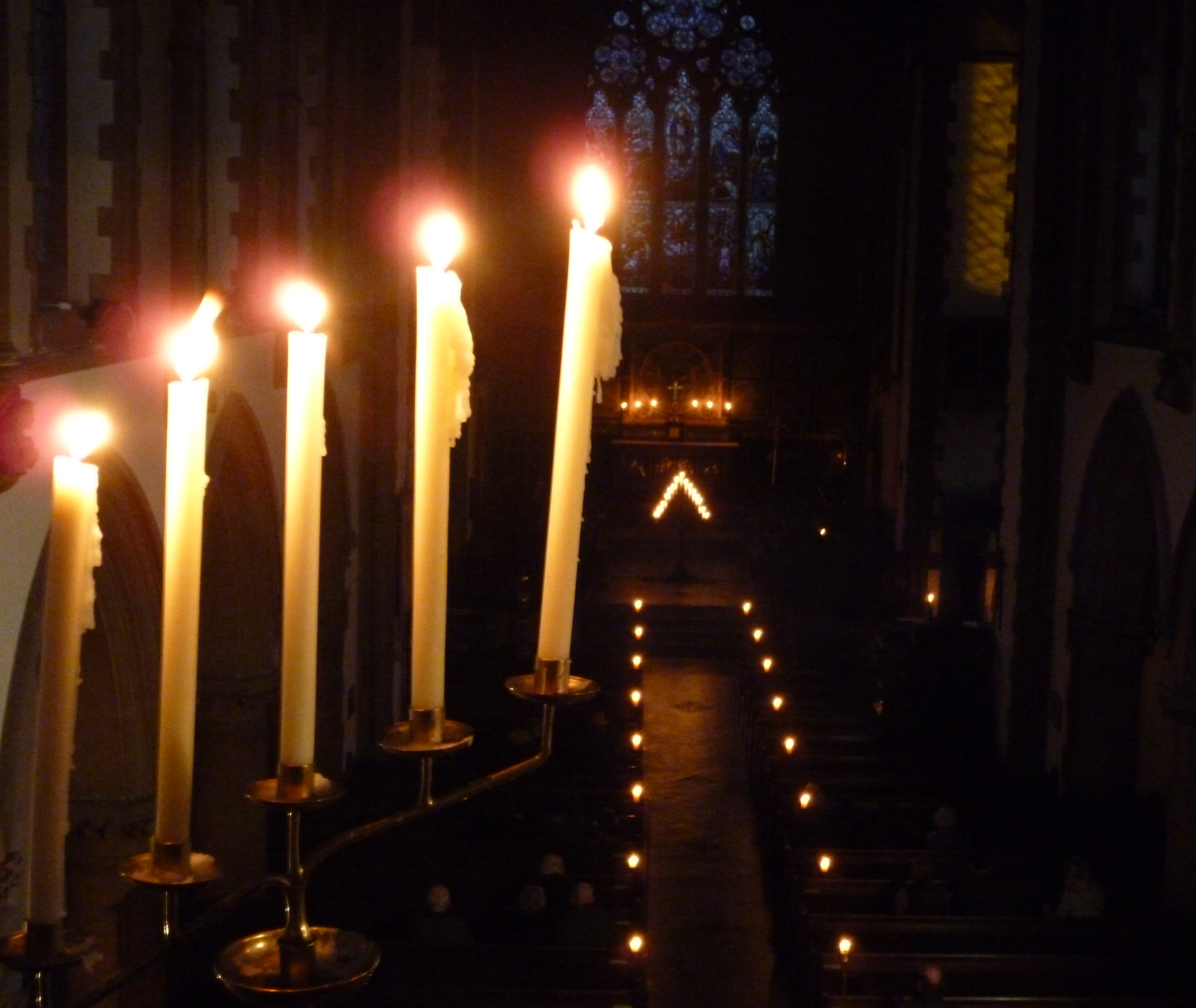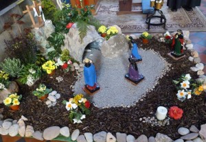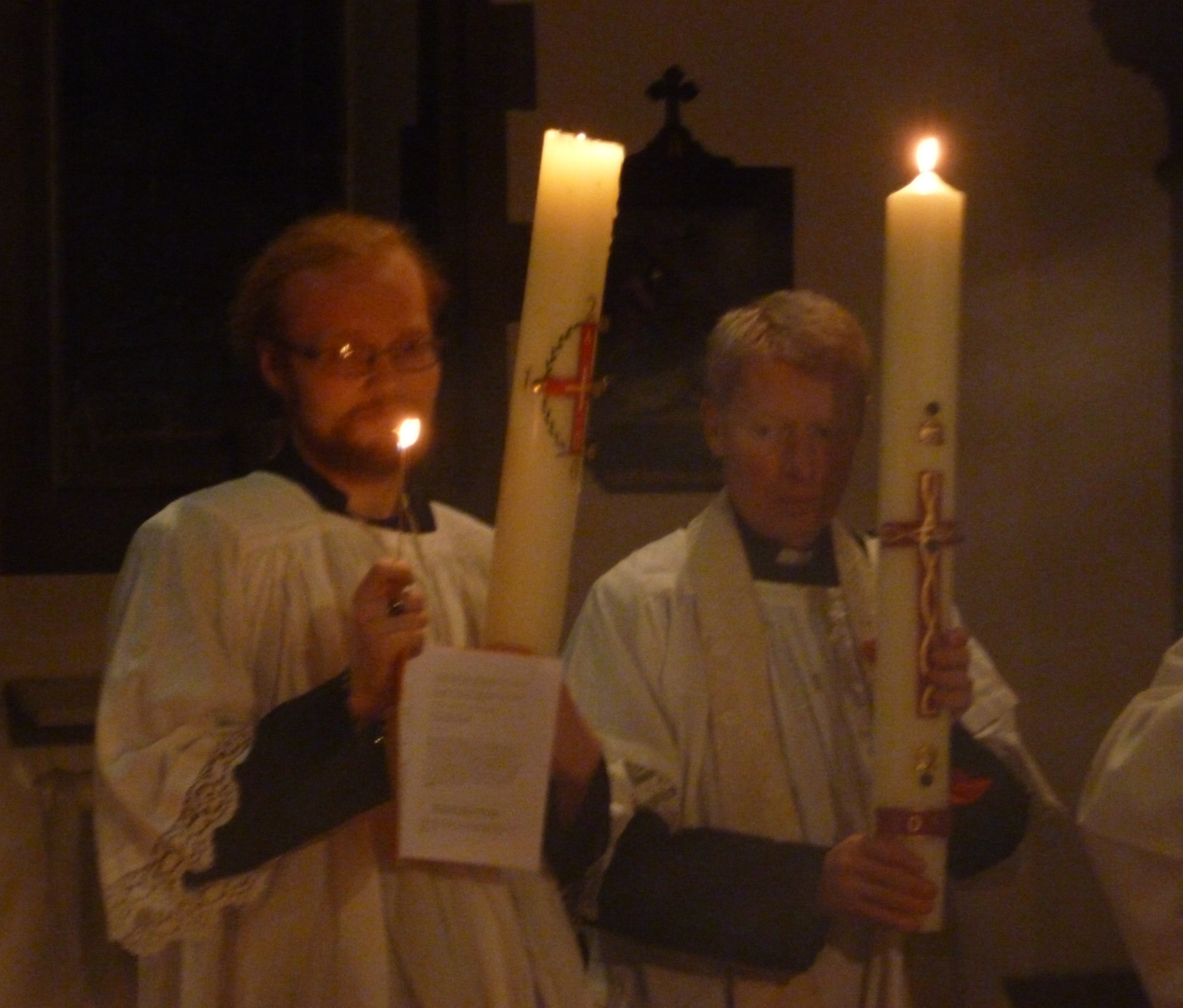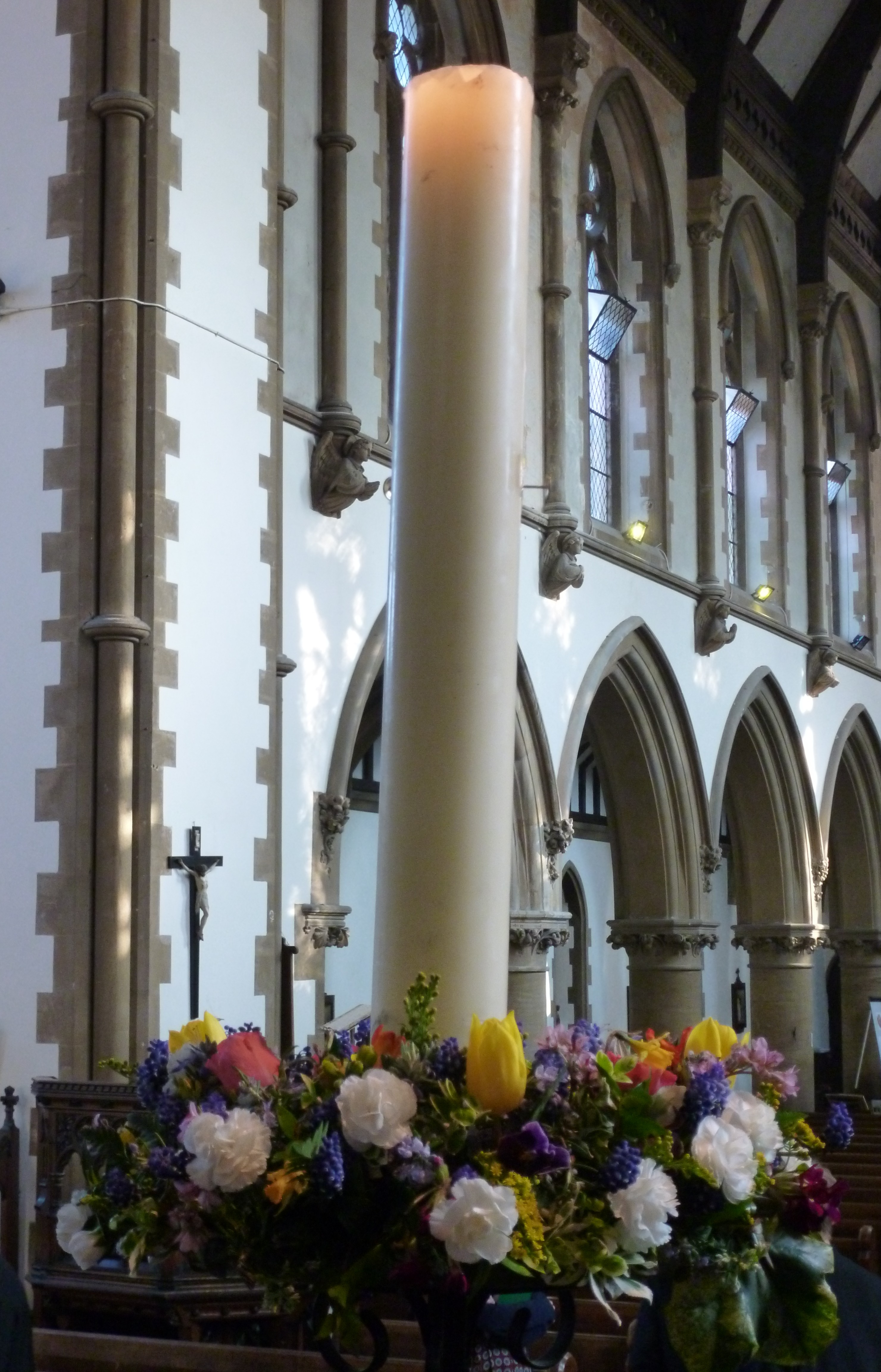 With our best robes and bonnets, chanting, incense, hundreds of candles and tables groaning with food and drink, the Easter Vigil at St Pythag’s to my fanciful eye looks rather like a banquet in the Great Hall at Hogwarts. Indeed, the purple robe, spear and stone have all played their hallowed parts in the story of the Passion and the love of Christ has triumphed, harrowing hell and dispelling the darknesses of this world with the grace and glory of his Resurrection. Alleluia!