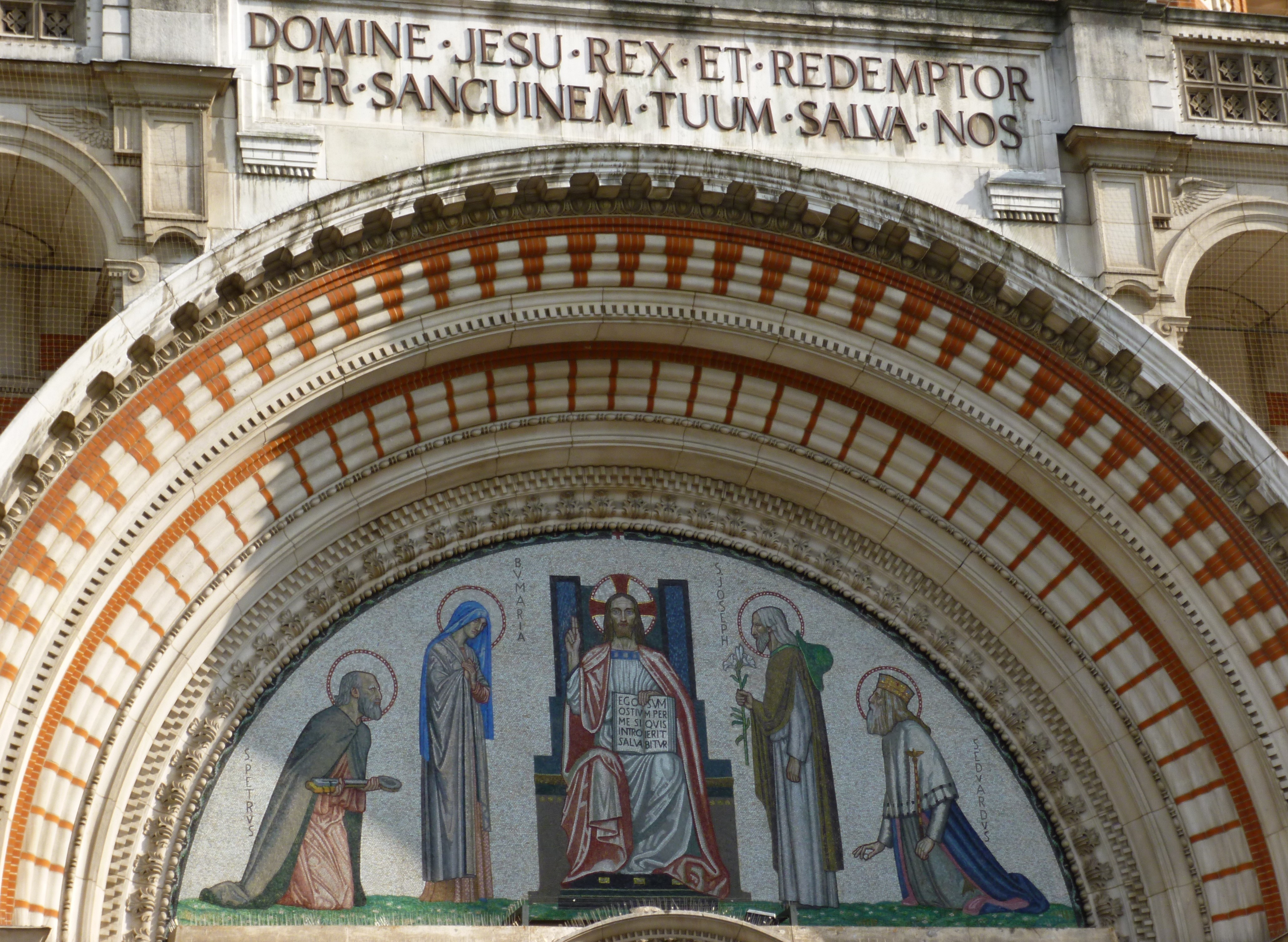 The great neo-Byzantine, start of the 20th century, Roman Catholic Westminster Cathedral also honours a St Edward in its tympanum over the West Doors, but it’s not entirely clear which one.