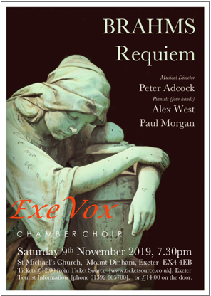 Saturday 9th November at 7.30 pm, Exevox Chamber Choir, directed by Peter Adcock, will be performing Brahms’ Requiem, accompanied by Alex West and Paul Morgan.