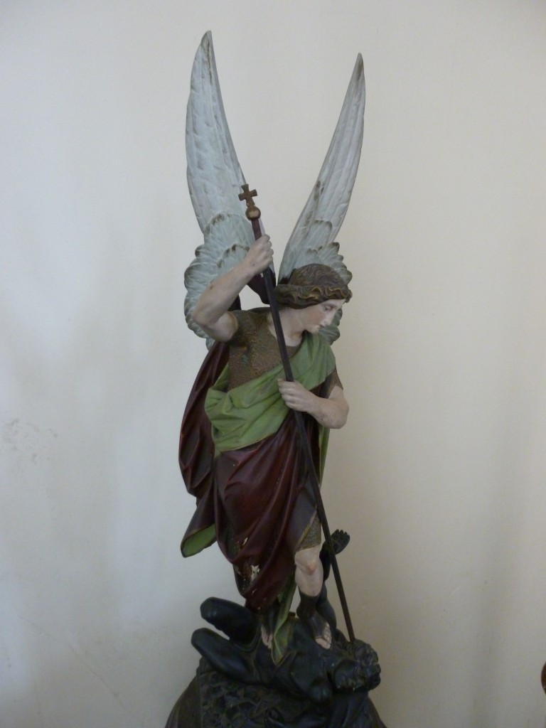 A small statue of St Michael defeating the Devil stands in the North Aisle. This was carved by a Bavarian artist in the 1860s and formerly stood on the alms box at the West end until this was stolen in the 1920s.