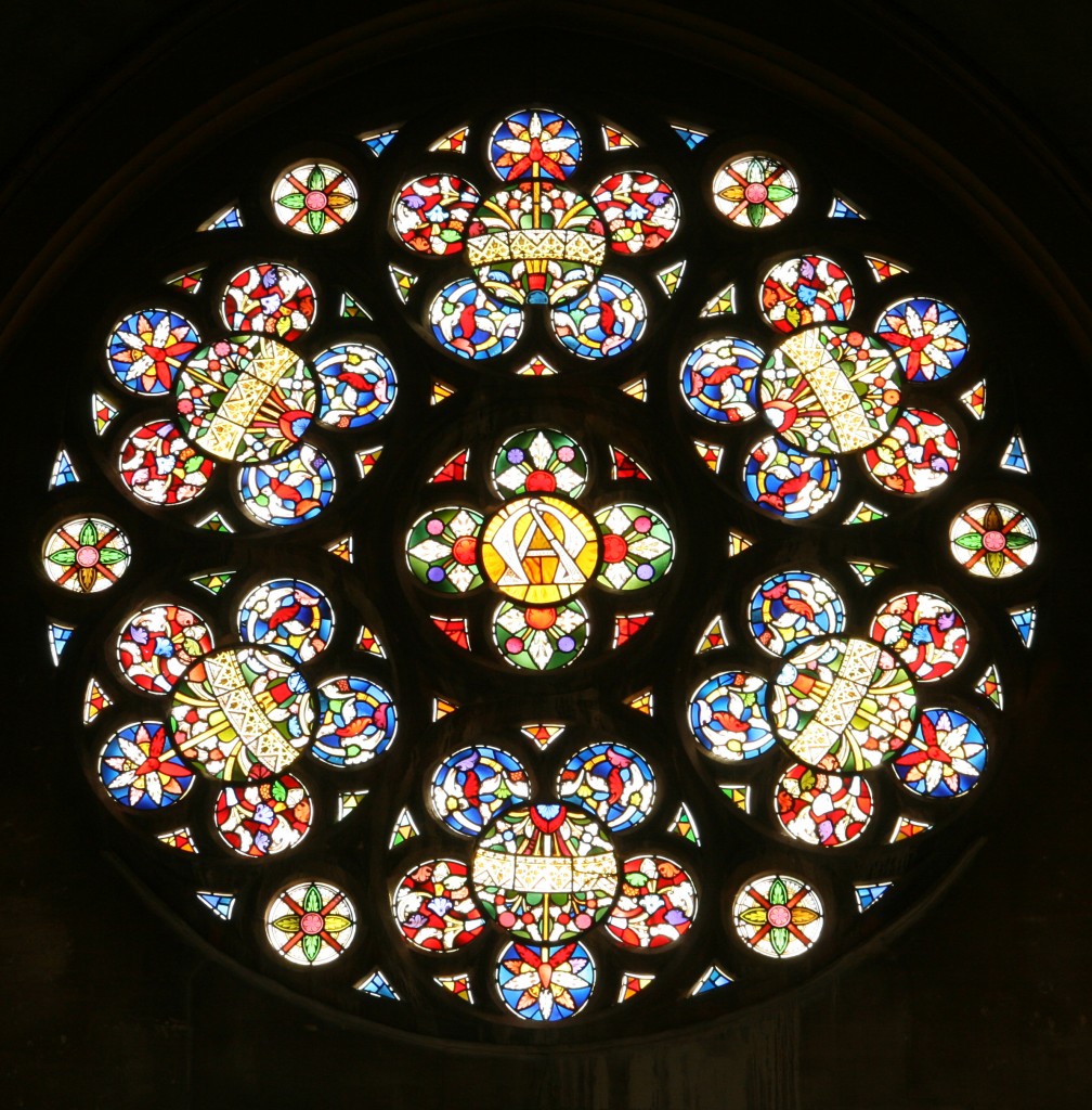 The stained glass of the beautiful Rose window is by Ward and Hughes of Soho, London, and features the Alpha and Omega letters signifying Christ as the beginning and end of all things.