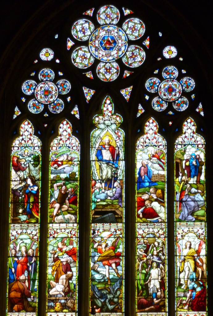 The stained glass of the east window is by Ward and Hughes of Soho; an unusual composition featuring encounters with angels from the Old and New Testaments. It is flanked by Old Testament Patriarchs and Prophets.