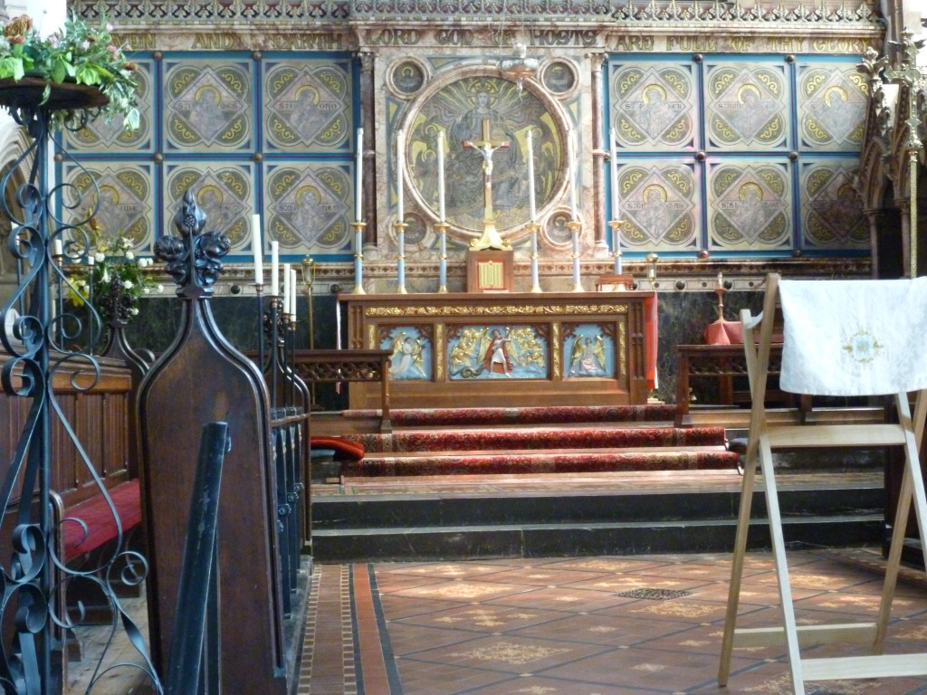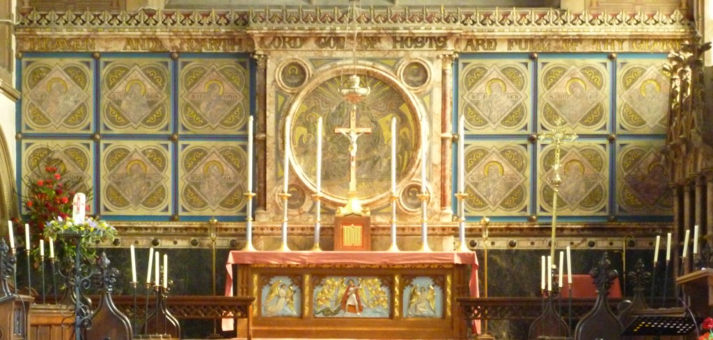 The mosaic and mastic reredos, with the 12 Apostles, was part of the original design by Hawkins, but was elaborated with mosaics featuring Christ in Glory and the 4 Evangelists and added in c.1900 by W.D. Caröe.