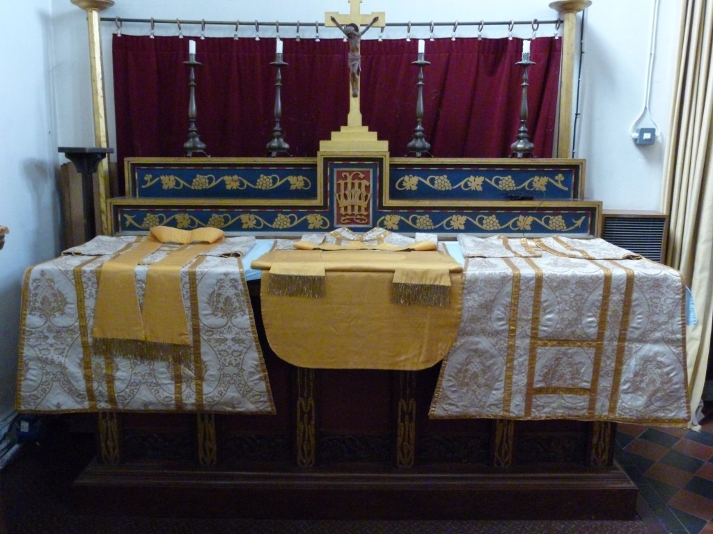 The dress of priests and deacons for Mass is “best clothes” of about AD 400, used for continuity and tradition. This set of gold vestments, chasuble, dalmatic and tunicle, is used for major Feasts of our Lord Jesus Christ.