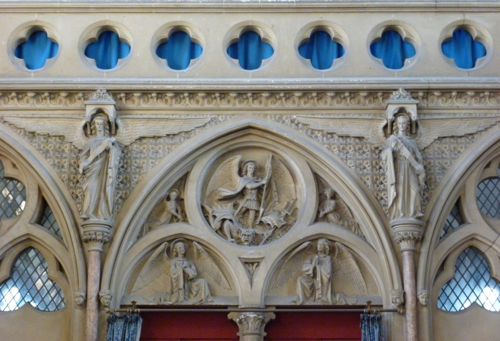 The West Front, with its processional doors flanked by marble columns and the Rose window and cross above, gives a foretaste of the heritage and liturgy to be found within our beautiful High Anglican, Victorian Gothic church. The roundel of the Archangels above the doors was carved by the distinguished Victorian sculptor Thomas Nicholls.