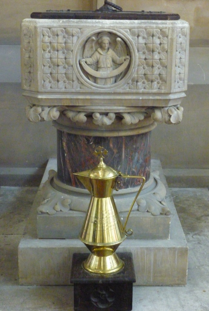 A person is baptised with water into full membership of Christ’s body, the Church, in the name of the Father, Son and Holy Spirit. Our large stone font, by the French sculptor Jacquet, is richly carved with the symbols of the 4 Evangelists and stands on an early French style column.