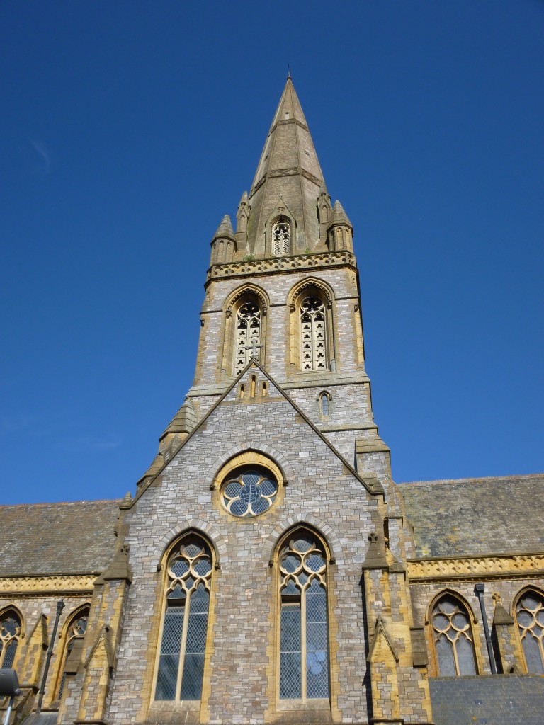 From the South, the neo-Gothic splendour of St Michael's church and spire stand above the Victorian cottages and faux Georgian crescent on Mount Dinham, with the tower of St David's church, rebuilt in 1900, in the background.