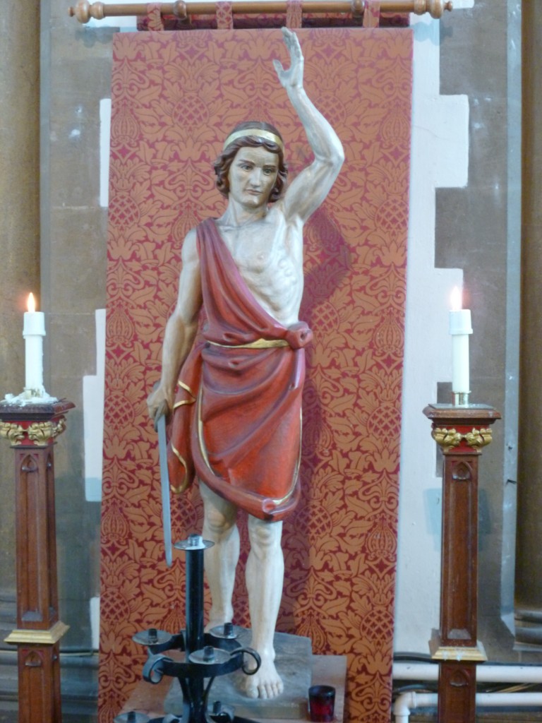 This statue was carved by a Cornish artist at St Ives and given to the Church after World War II; it depicts the saint without wings and is often mistaken for the young David.