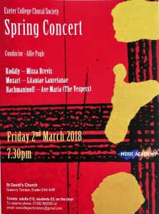Fri 2 Mar at St David’s Church. 7.30pm Exeter College Choral Society conducted by Alfie Pugh, accompanied by John Draisey. Mozart, Kodaly & Rachmaninov. £12 (£5 students).