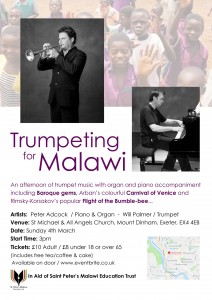 Sun 4 Mar, 3pm. Trumpet, Organ & Piano Recital, Will Palmer & Peter Adcock. Fundraiser for St Peter’s School Malawi Project.