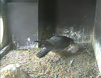 We hope that the 4 Peregrine eggs laid towards the end of March will have hatched; their “due date” was Thurs 30th April. In fact, the 1st egg hatched about 6.30 that morning, and a 2nd chick emerged early on Sat 2nd May, but it looks like the other 2 eggs are not going to hatch. You can watch the chicks live online at /peregrine-falcons/ (and donate towards the cost of streaming) – a little warning that feeding can be messy.