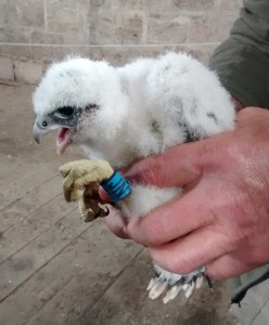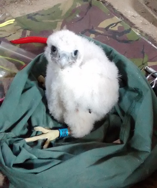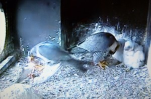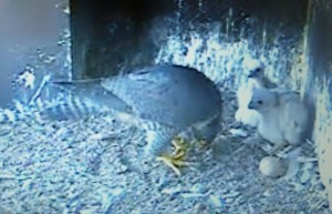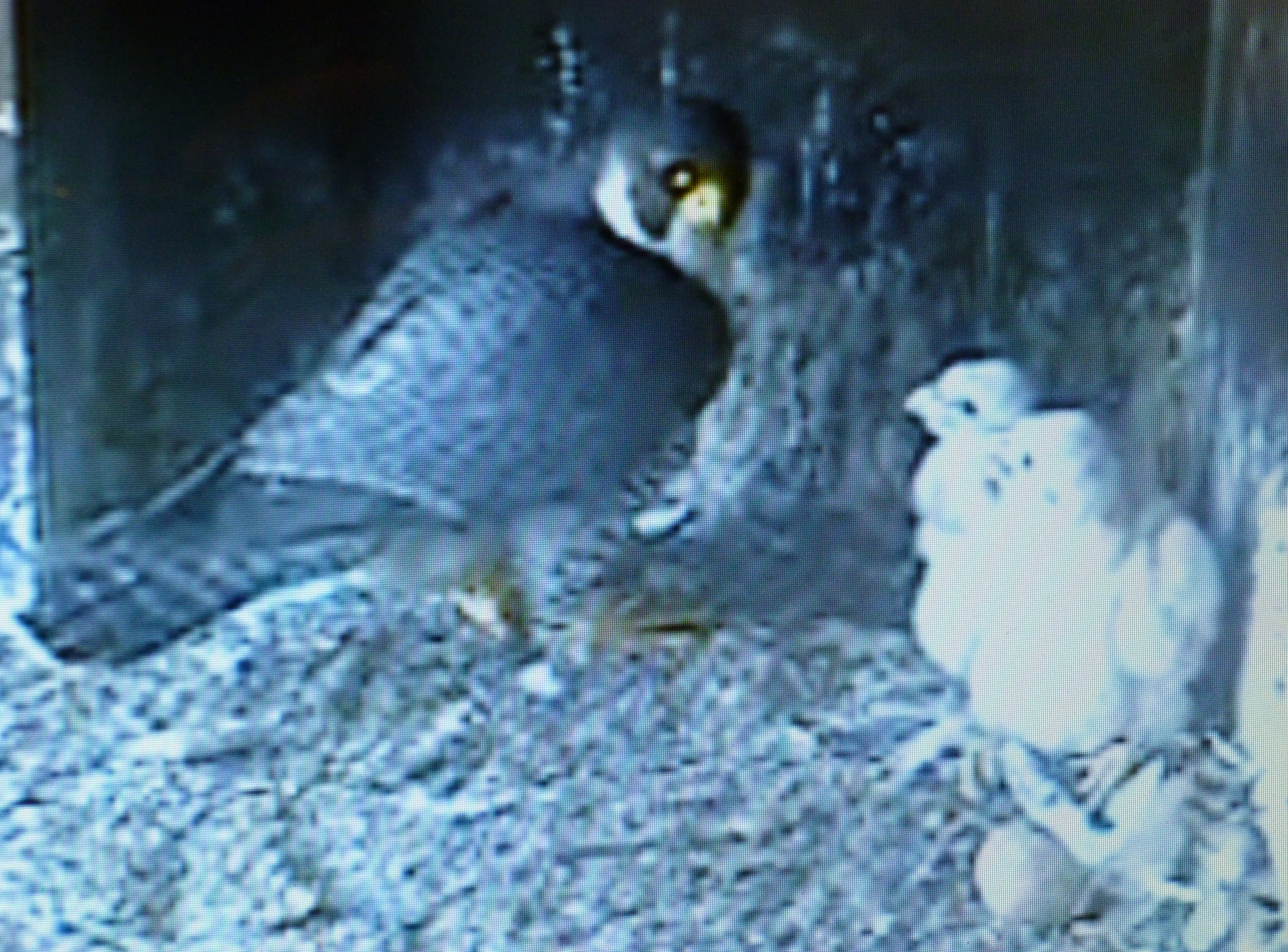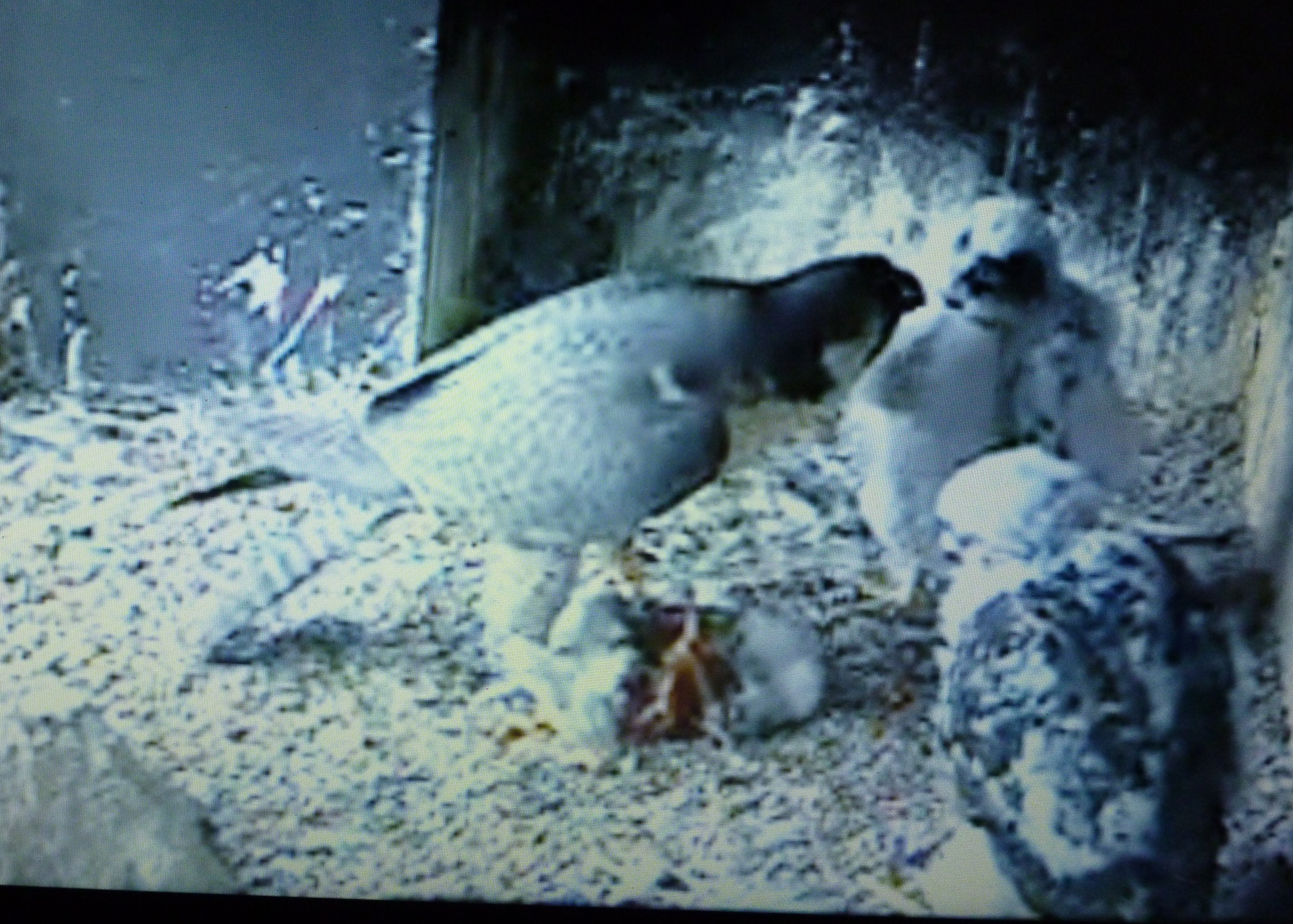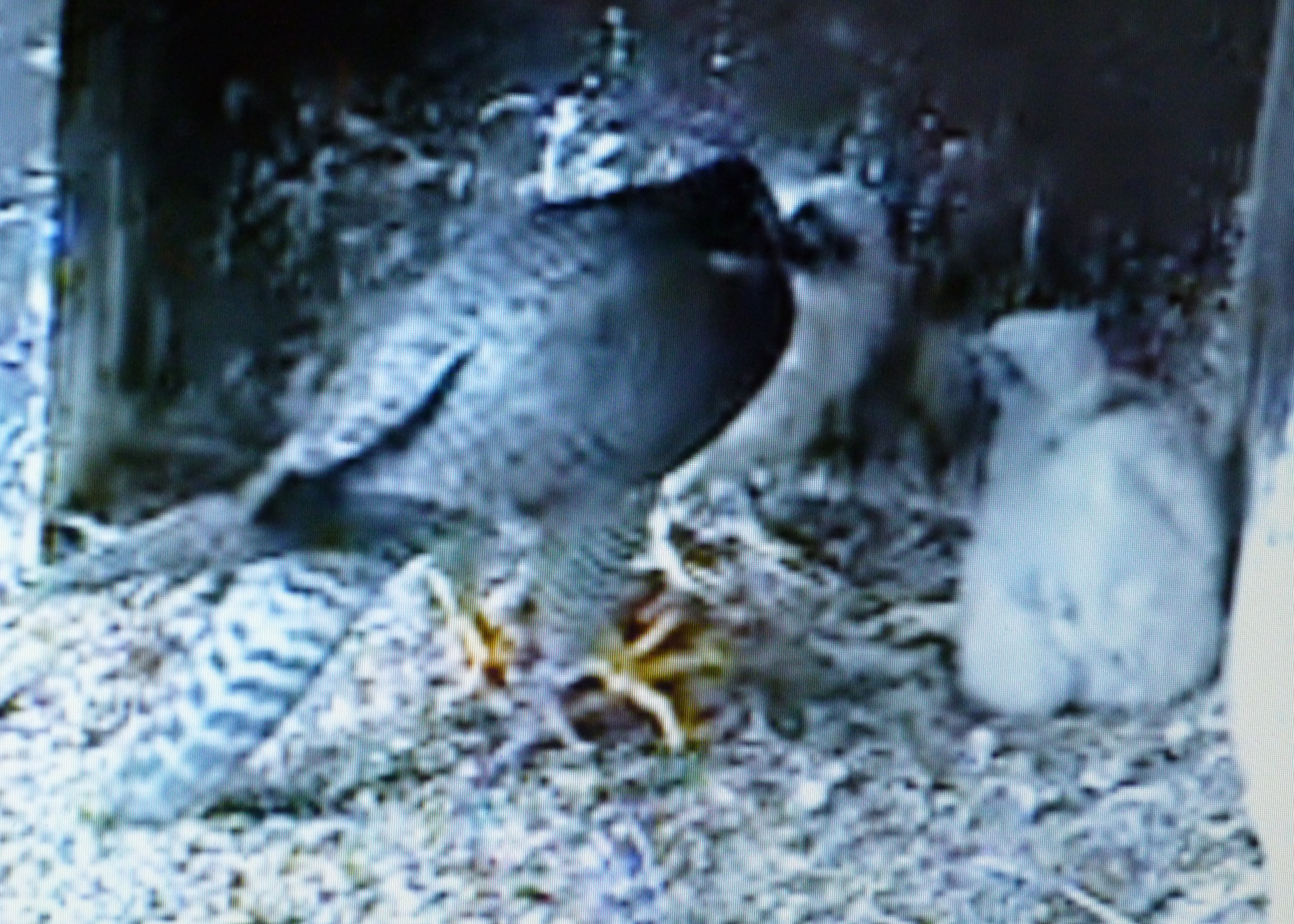 May23 update. Three weeks old and the two chicks have been weighed, to check development and discover that we have one female and one male this year, and had identifying leg rings fitted, to help with scientific study of survival rates and dispersion of urban peregrines. They appear to be healthy and growing well. This despite the adults seeming to spend as much time clearing their Exeter airspace of other raptors especially buzzards, as they do hunting for prey to feed their chicks.