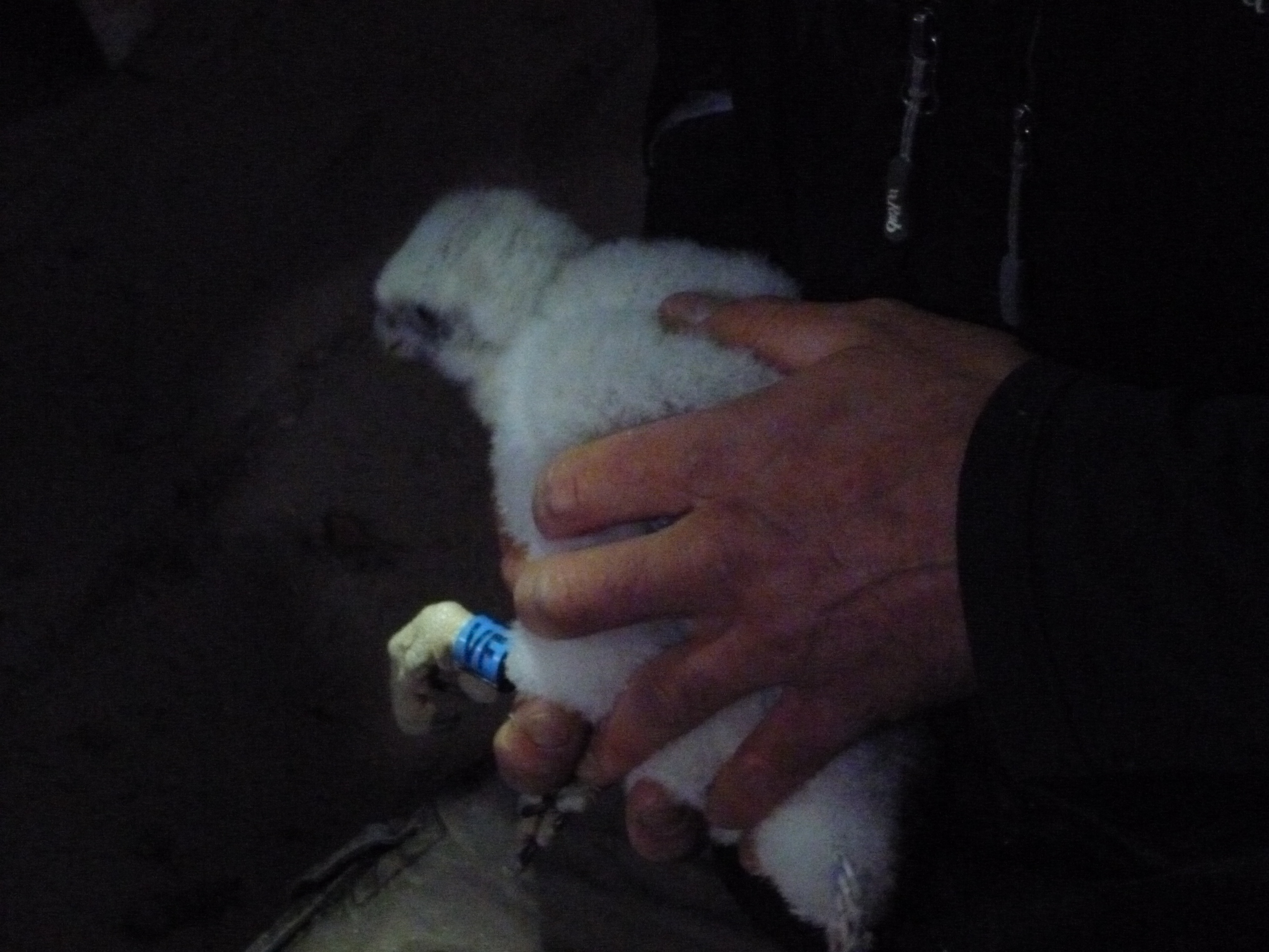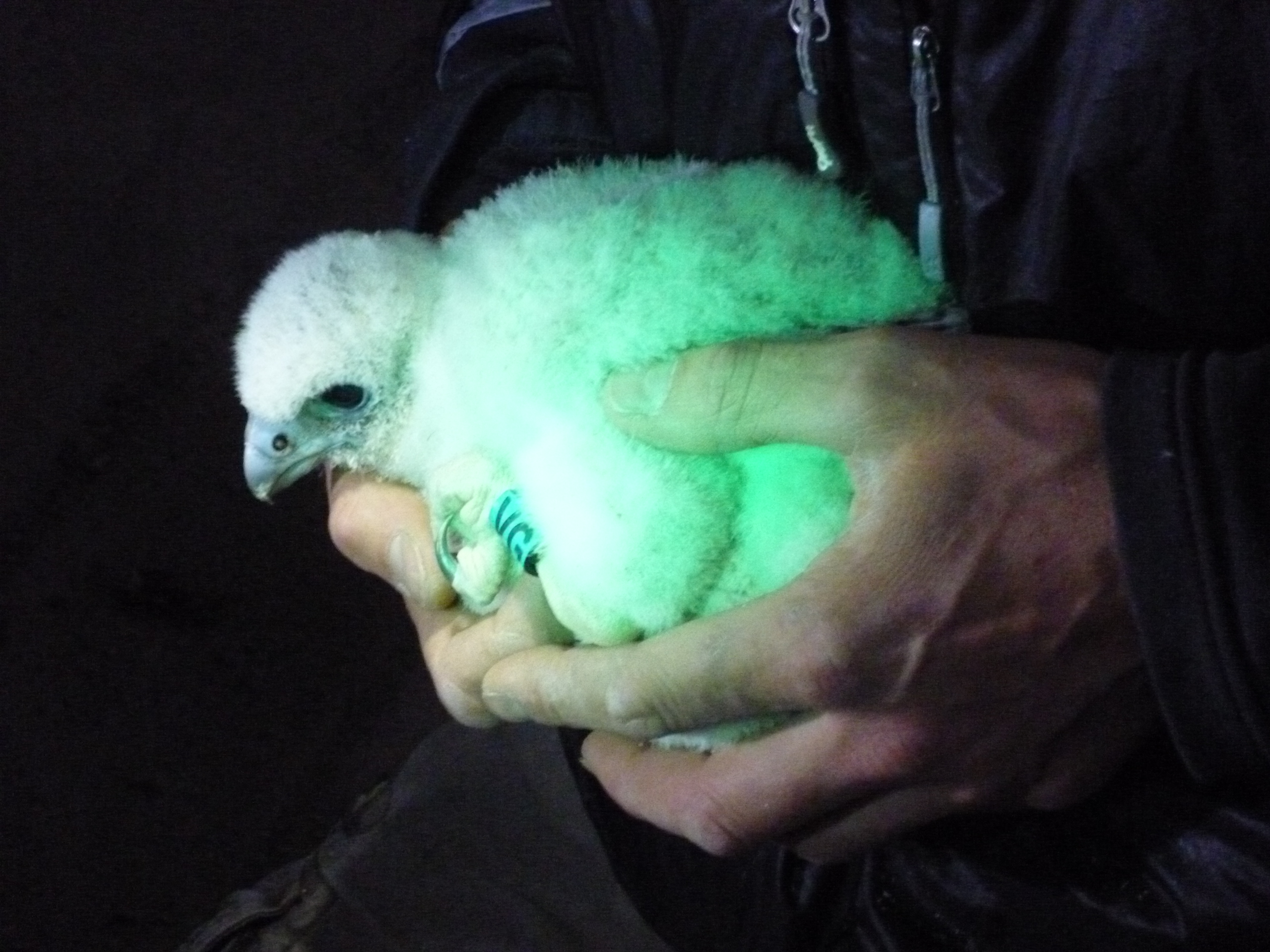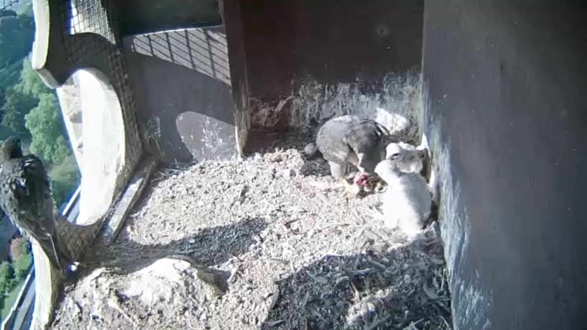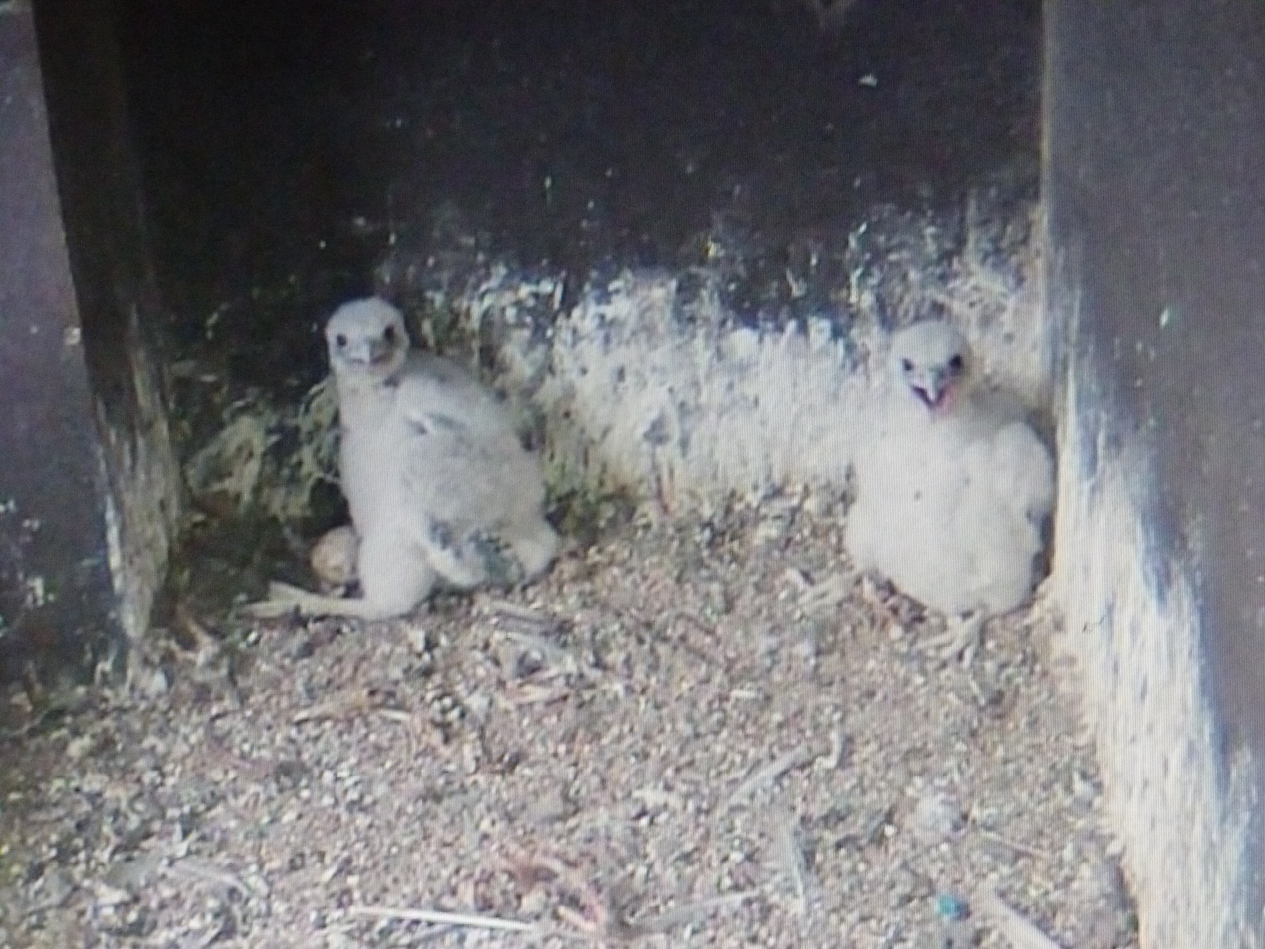 Two eggs hatched this year, on Star Wars Day Fri 4 May & Sat 5 May; the third egg did not hatch and has been removed under license for analysis. After some early quarrelling between the adults over feeding the chicks, they have been more cooperative recently, and the weights & measurements of the chicks at 3 weeks indicates that they are being well fed and developing. The next 3-4 weeks should see them transform form fluffy chicks barely able to move around to fully feathered juveniles ready to fledge the nest box.